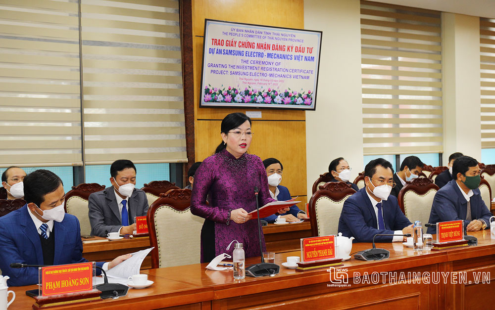 在仪式上发表讲话时,省委书记同志对三星集团继续在太原省展开投资的决定表示高兴。她说:太原省是北部中游山区中心、所属首都地区和河内首都北边门口的顺便地理位置,太原省的基础设施已经和正在同步、现代的投资;投资环境顺利和通畅,所以该地方具有吸引国内外投资商的许多潜能。