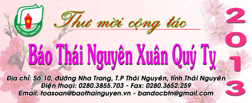 Chào Xuân mới Quý Tỵ 2013 với nhiều dự định, kỳ vọng lớn lao, Báo Thái Nguyên dự kiến xuất bản số báo Xuân dày khoảng 100 trang, với nội dung phong phú, hấp dẫn. Để thực hiện số báo này, xin trân trọng kính mời: Các học giả, nhà nghiên cứu, văn nghệ sĩ... cùng tất cả cộng tác viên trong và ngoài tỉnh tham gia gửi bài, ảnh, truyện ngắn, thơ, truyện vui, câu đối... cho Tòa soạn.