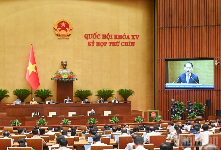 | Quốc hội làm việc tại hội trường nghe báo cáo giải trình, tiếp thu ý kiến nhân dân, ý kiến thảo luận tại tổ và hội trường (lần thứ nhất) của các đại biểu Quốc hội và chỉnh lý dự thảo Nghị quyết của Quốc hội về sửa đổi, bổ sung một số điều của Hiến pháp năm 2013. (Ảnh: DUY LINH) |