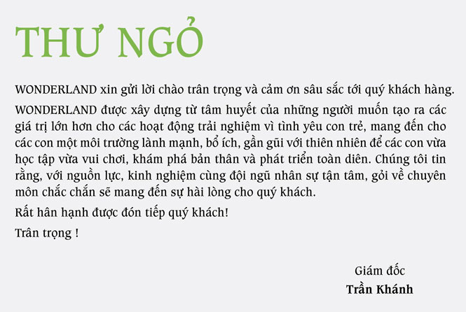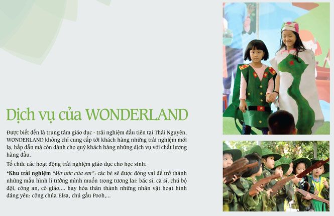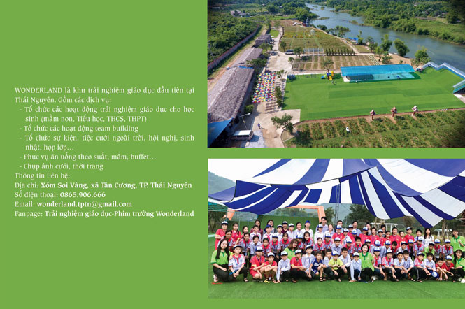 Địa chỉ: xóm Soi Vàng, xã Tân Cương, T.P Thái Nguyên Điện thoại: 0865.906.606 Email: wonderland.tptn@gmail.com Fanpage:Trải nghiệm giáo dục-Phim trường Wonderland