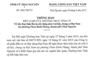 Thông báo Kết luận của Thường trực Tỉnh ủy về việc thực hiện Dự án xây dựng nhà ở xã hội, chung cư Đại Nam tại phường Phan Đình Phùng, thành phố Thái Nguyên.
