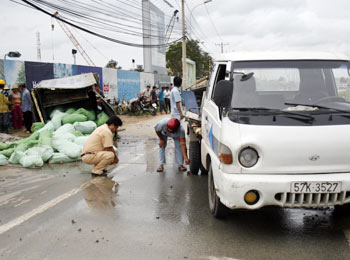 Trưa 7-8-2008, xe tải chở đá tinh khiết đang lưu thông trên đường Nguyễn Văn Minh (quận 2, TP HCM) bỗng thùng hàng rơi khỏi đầu xe, va vào lề đường làm 4 người bị thương.