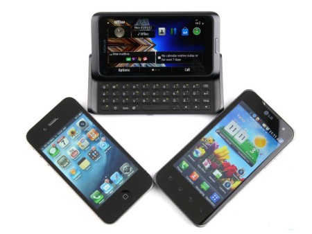 Nokia E7 chạy hệ điều hành Symbian 3, màn hình 4 inch công nghệ ClearBlack được đánh giá là đẹp, sắc nét và có góc nhìn cao hơn 2 đối thủ. Tuy nhiên, máy chạy chậm hơn hẳn ở màn thử nghiệm lướt web do sử dụng chip tốc độ chỉ 680 MHz.