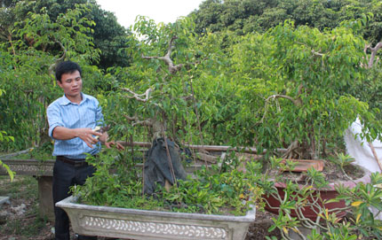 Vừa bước vào cổng, chúng tôi thấy anh đang cẩn thận cắt tỉa lá, uốn cành bên chậu cây sanh. Cạnh đó, hàng chục bồn cây khác với nhiều hình dáng, kích thước khác nhau được chăm sóc, tạo dáng rất công phu, tỷ mỷ. Chiêm ngưỡng những sinh vật cảnh đó, nhiều người sẽ nghĩ rằng, chủ nhân của nó phải là người có thâm niên trong nghề chơi cây cảnh. Thấy chúng tôi tò mò hỏi chuyện, anh cho biết: Tôi mê cây cảnh từ những năm học phổ thông. Khi đó, tôi đã sưu tập được một số cây để trồng trong vườn. Tốt nghiệp THPT, tôi theo học ngành Kiểm lâm Trường Trung cấp Lâm nghiệp I (Quảng Ninh). Hơn 2 năm, tôi không chỉ học những kiến thức về cây giống, cách ghép, chăm sóc cây… mà còn dành thời gian để học thêm bên ngoài về thú chơi cây cảnh. Điều mà tôi luôn ấp ủ”.