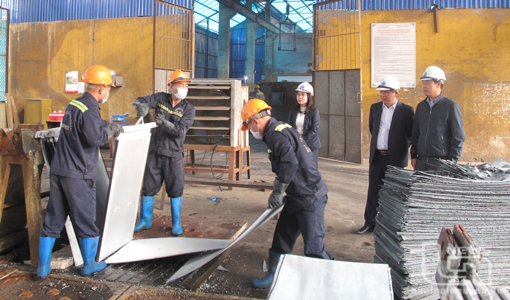 | Lãnh đạo Công ty CP Kim loại màu Thái Nguyên động viên, kiểm tra tình hình sản xuất dịp trước Tết Nguyên đán 2025 tại Nhà máy Kẽm điện phân Thái Nguyên. |