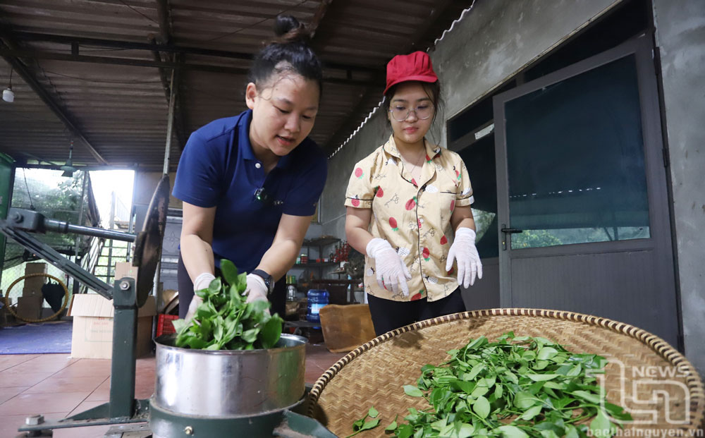| Chị Phạm Thị Giang, Giám đốc Hợp tác xã Trà Giang, sơ chế nguyên liệu để sản xuất hồng trà, giúp nâng cao giá trị chè trung du. |