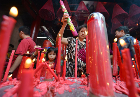 Những người phụ nữ Thái Lan khấn vái tại một ngôi đền Trung Quốc tại khu người Hoa ở thủ đô Bangkok của Thái Lan.