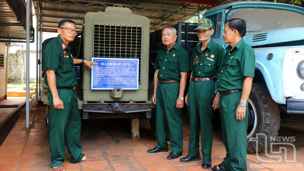 | Các cựu chiến binh bên chiếc máy bơm dầu HY 35/70, loại máy bơm đã chuyển tải hàng vạn lít xăng dầu từ miền Bắc chi viện cho chiến trường miền Nam. |