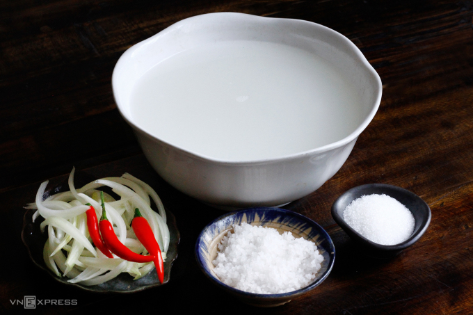 Chuẩn bị các nguyên liệu khác: Nước vo gạo bỏ nước đầu, dùng nước lọc sạch vo lấy nước thứ hai 1,2 - 1,5 lít để riêng. Sau đó cho 2 - 2,5 thìa canh muối hạt, 1 thìa canh đường vào khuấy tan. Đường và nước vo gạo giúp muối dưa lên men nhanh hơn vào mùa đông, nếu mùa hè thì không cần cho đường. Hành tây bóc vỏ, thái múi cau nhỏ. Hành củ bóc vỏ, thái lát mỏng. Ớt bỏ hạt, thái lát.