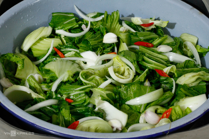 Rửa dưa: Dưa cải sau khi hong rút nước, đem rửa lại nhiều lần dưới vòi nước chảy cho sạch, cắt khúc vừa ăn rồi trộn lẫn hành tây, hành củ và ngâm rửa qua nước muối loãng. Sau đó, vớt ra để ráo nước.