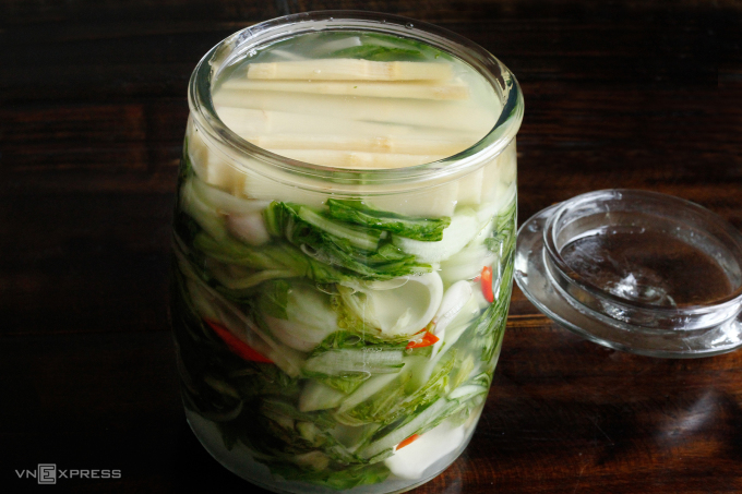 Muối dưa: Cho dưa cải trộn lẫn hành hoa, hành tím vào lọ sứ, thủy tinh sạch (đã tiệt trùng, phơi khô). Bên trên dùng mía chẻ lèn chặt rồi đổ nước gạo đã khuấy tan muối, đường vào ngập mặt, đậy kín để nơi thoáng mát.