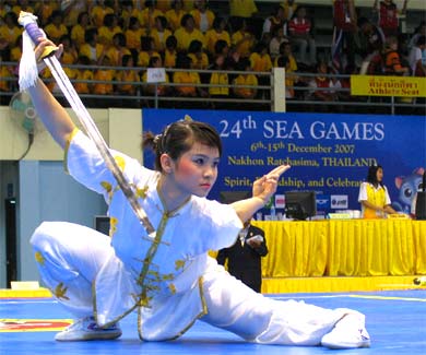 Cũng môn wushu, nhưng ở nội dung tán thủ, Nguyễn Thuý Ngân đoạt HC vàng hạng dưới 52 kg của nữ. Võ sĩ người Hà Nội đã thắng đối thủ người Philippines trong trận chung kết.