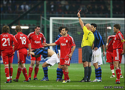 Rõ ràng kịch bản cũ ở trận lượt đi đang lặp lại trên sân Giuseppe Meazza, Inter chơi ngang ngửa với Liverpool cho đến khi phải chơi kém người vì chiếc thẻ đỏ oan nghiệt. Nhiệm vụ lúc này với Inter là quá khó - phải ghi tới 4 bàn thắng vào lưới thủ môn Reina.