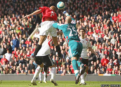 Khi hiệp 1 chỉ còn 10 phút, các hậu vệ Liverpool hết sức chủ quan khi tập trung vào Ronaldo, Giggs mà không ai kèm hậu vệ Brown băng lên bật cao ghi bàn mở tỉ số cho đội chủ nhà bằng…lưng từ đường tạt bóng vào của Rooney. Bàn thua này cũng thấy rõ sai lầm của thủ môn Reina khi chọn điểm rơi không hợp lý để mình rơi vào thế hoàn toàn bị động trước Brown.