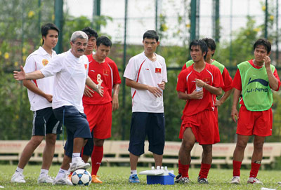 Ở phần tập thêm bài tạt cánh đánh đầu, dù đứng trong khung gỗ là thủ thành hộ pháp Santos, nhưng trước những cú đánh đầu chính xác và đầy uy lực của trợ lý Phan Thanh Hùng, các cầu thủ vẫn phải lè lưỡi.