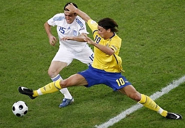 Chưa đầy hai phút sau pha lỡ ăn, các nhà đương kim vô địch bất ngờ phải nhận ngay đòn đau. Sau pha phối bóng với Henrik Larsson, Ibrahimovic nhận bóng trở lại rồi tung ra cú sút má ngoài chân phải tuyệt đẹp từ ngoài 25 mét. Bóng vượt tầm kiểm soát của thủ thành Nikopolidis đi vào lưới, mở tỷ số cho Thụy Điển. Đó là pha làm bàn đầu tiên của tiền đạo Inter ghi cho đội tuyển Bắc Âu kể từ năm 2005.