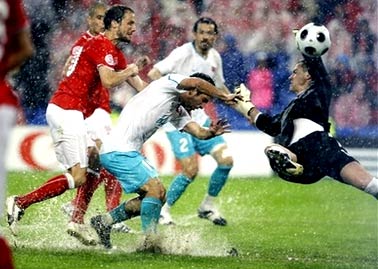Phút 23, Hakan Yakin sút căng từ ngoài khu cấm địa (hơn 20 m). Bóng bay mạnh dưới trời mưa to, nhưng thủ thành Thổ Nhĩ Kỳ vẫn xuất sắc cản phá. Chỉ khoảng 60 giây sau, Demirel của Thổ Nhĩ Kỳ lại bay người tuyệt đẹp, đẩy cú đá phạt hàng rào đưa bóng ra ngoài biên. Phút 32, Thuỵ Sĩ phá thế cân bằng. Hakan Yakin dễ dàng đệm bóng cận thành chính xác trong tư thế không người kèm, khi mặt sân ướt sũng nước mưa giúp hãm bóng ở lại khu 5m50 của Thỗ Nhĩ Kỳ, sau quả chuyền ngang sệt và mạnh từ mé phải của Eren Derdiyok - cầu thủ mới 19 tuổi. Trong đà hưng phấn tấn công của Thuỵ Sĩ, chính Yakin lãng phí thời cơ nhân đôi cách biệt, khi đệm bóng chệch cột dọc ở cự ly chỉ khoảng 6 mét, sau quả căng ngang từ cánh phải. Nếu có bàn thắng này, đội đồng chủ nhà nhiều khả năng sẽ kết thúc trận đấu với ít nhất 1 điểm.