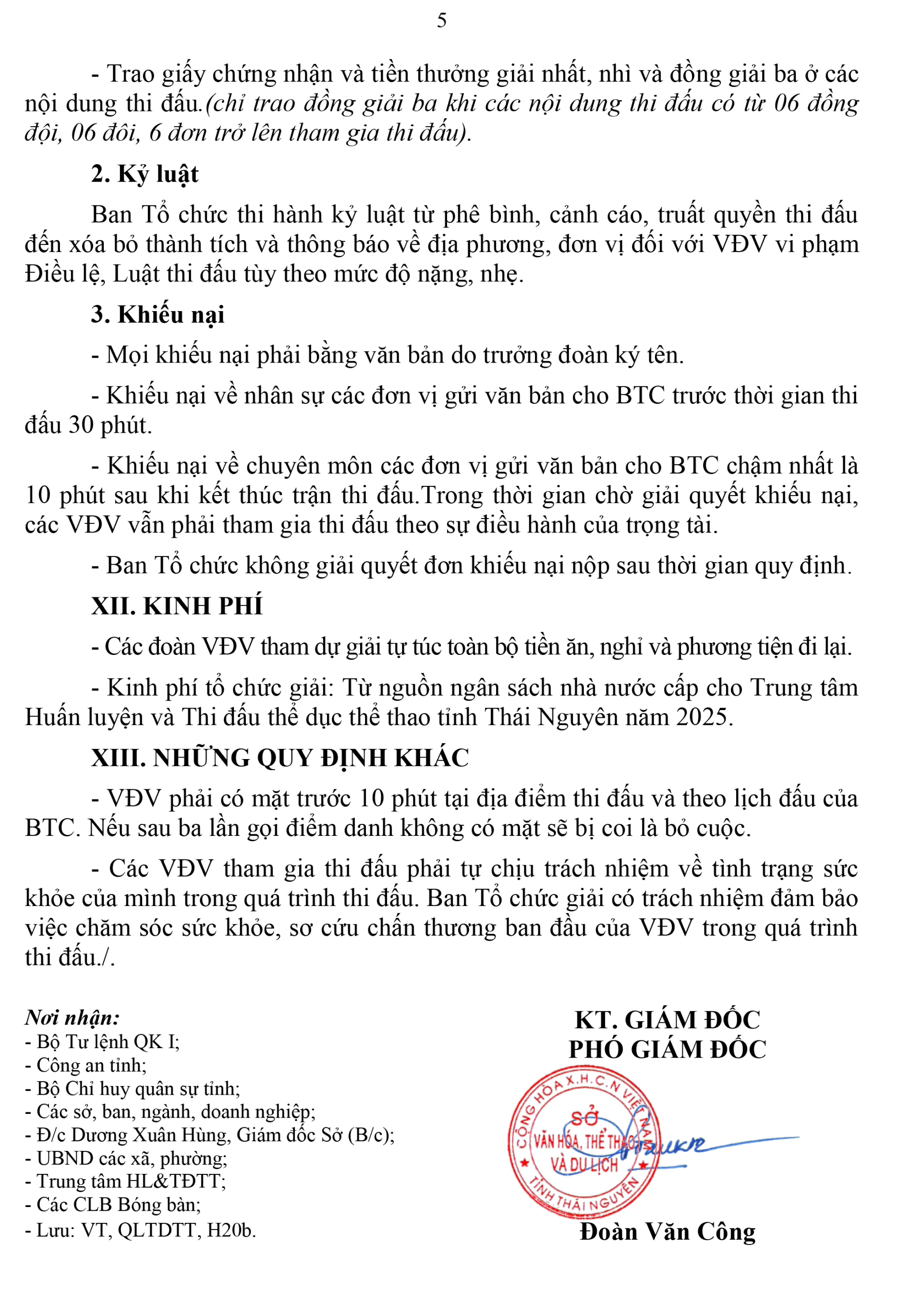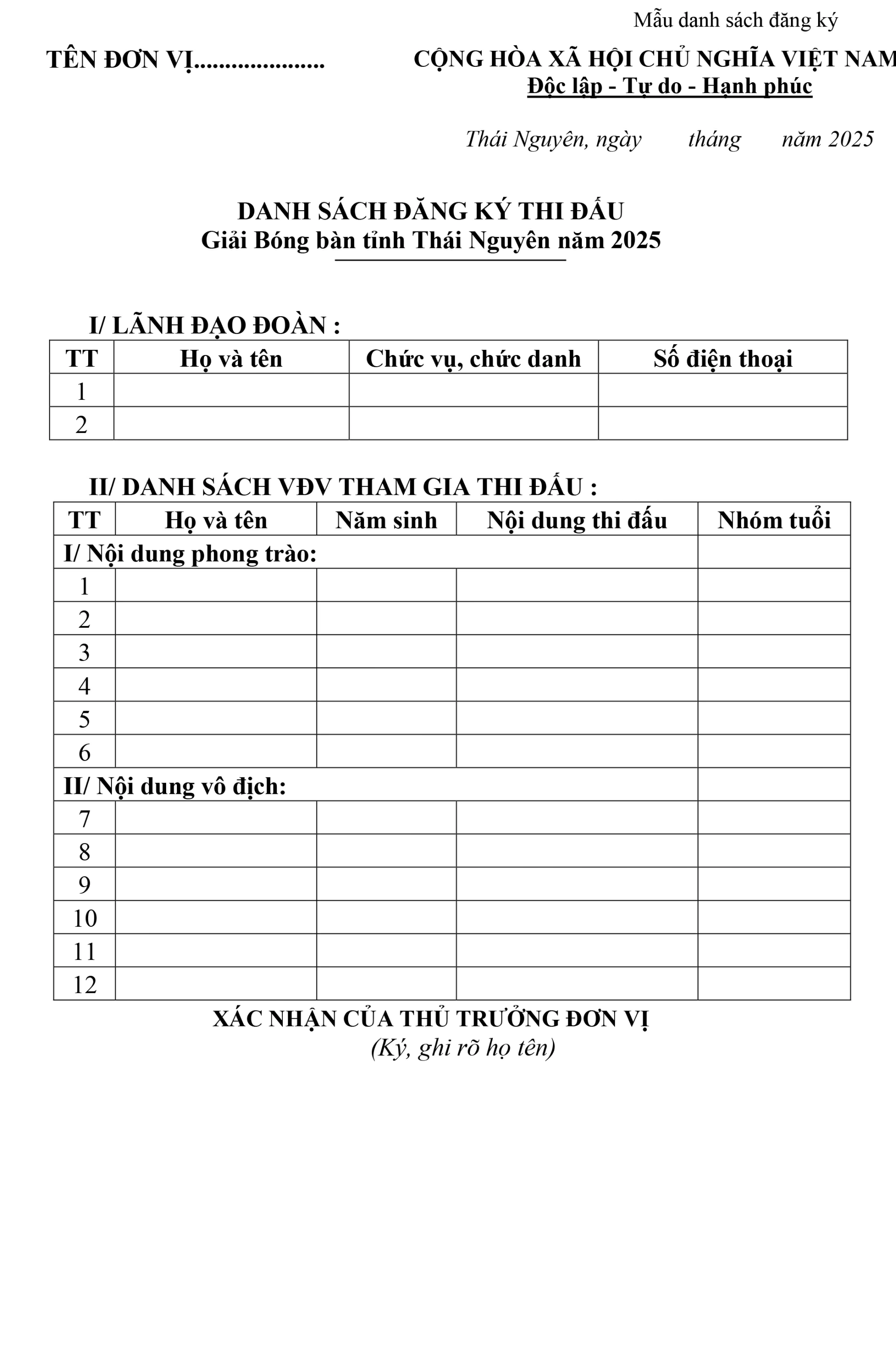 Sở Văn hóa, Thể thao và Du lịch tỉnh Thái Nguyên đã ban hành Điều lệ Giải Bóng bàn tỉnh Thái Nguyên năm 2025. Giải đấu được tổ chức nhằm thiết thực chào mừng 80 năm Cách mạng Tháng Tám và Quốc khánh 2-9, hưởng ứng cuộc vận động “Toàn dân rèn luyện thân thể theo gương Bác Hồ vĩ đại”, tiếp tục lan tỏa phong trào tập luyện, thi đấu môn Bóng bàn, góp phần nâng cao sức khỏe nhân dân. Đây cũng là dịp để phát hiện, tuyển chọn vận động viên xuất sắc tham gia các giải khu vực và toàn quốc.