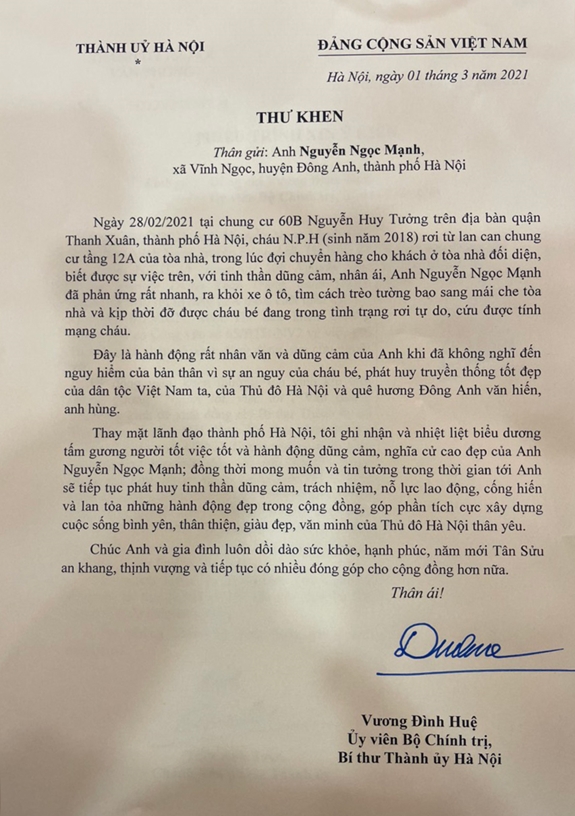 Sáng 1-3, thay mặt Thành ủy Hà Nội, đồng chí Vương Đình Huệ, Ủy viên Bộ Chính trị, Bí thư Thành ủy Hà Nội đã gửi thư khen ngợi tinh thần dũng cảm cứu người của anh Nguyễn Ngọc Mạnh, thường trú tại xóm 4, thôn Vĩnh Thạnh, xã Vĩnh Ngọc, huyện Đông Anh đã có hành động dũng cảm cứu người tại tòa nhà 60B, phố Nguyễn Huy Tưởng, phường Thanh Xuân Trung, quận Thanh Xuân ngày 28-2.