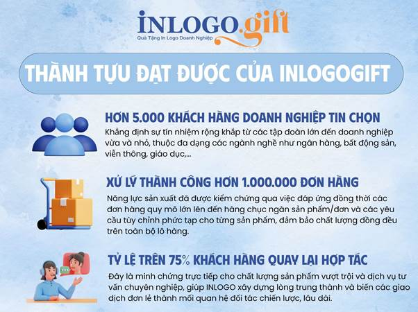 Được thành lập vào năm 2020, quà tặng INLOGO đã nhanh chóng khẳng định vị thế dẫn đầu trong lĩnh vực quà tặng doanh nghiệp. Uy tín và năng lực của chúng tôi được đo lường bằng những dữ liệu vận hành cụ thể, minh chứng cho sự tín nhiệm vững chắc từ thị trường: