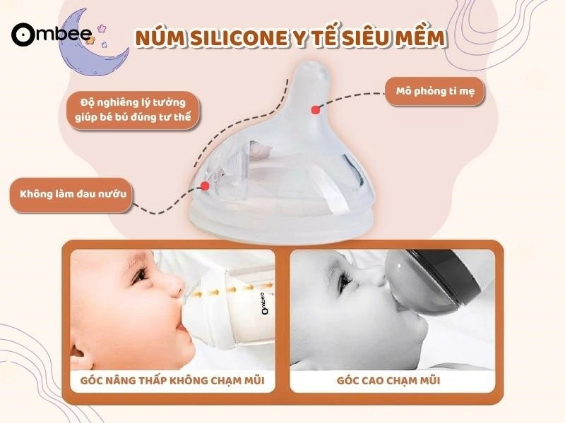 Ngoài ra, điểm đặc biệt của bình sữa Ombee còn ở thiết kế núm ti silicone y tế cao cấp, mô phỏng ti mẹ. Thiết kế lệch tâm giúp bé không cần ngửa cổ nhiều khi bú, từ đó duy trì phản xạ bú tự nhiên và hạn chế nuốt khí vào bụng - một điểm cộng rất lớn mà nhiều mẹ đánh giá cao. Đây là yếu tố được nhiều chuyên gia và mẹ bỉm đánh giá cao, đặc biệt với trẻ sơ sinh đang trong giai đoạn hình thành phản xạ bú.