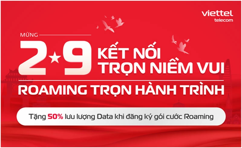 Nằm trong chương trình “Kết nối trọn niềm vui – Mừng 2/9”, từ 25-8 đến 08/9/2025, khách hàng Viettel sẽ được nhận thêm 50% lưu lượng data khi đăng ký gói cước Roaming tại 8 quốc gia/vùng lãnh thổ: Hàn Quốc, Trung Quốc, Malaysia, Thái Lan, Đài Loan (Trung Quốc), UAE, Nga và Úc. Cùng Viettel tận hưởng kết nối mượt mà, hòa chung vào không khí tưng bừng của ngày hội non sông.
