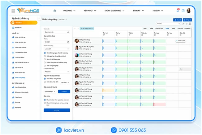 + LV SureHCS C&B: Phần mềm chấm công tự động hóa toàn bộ quy trình chấm công, tính lương, quản lý bảo hiểm – thuế thu nhập cá nhân, các chính sách phúc lợi.