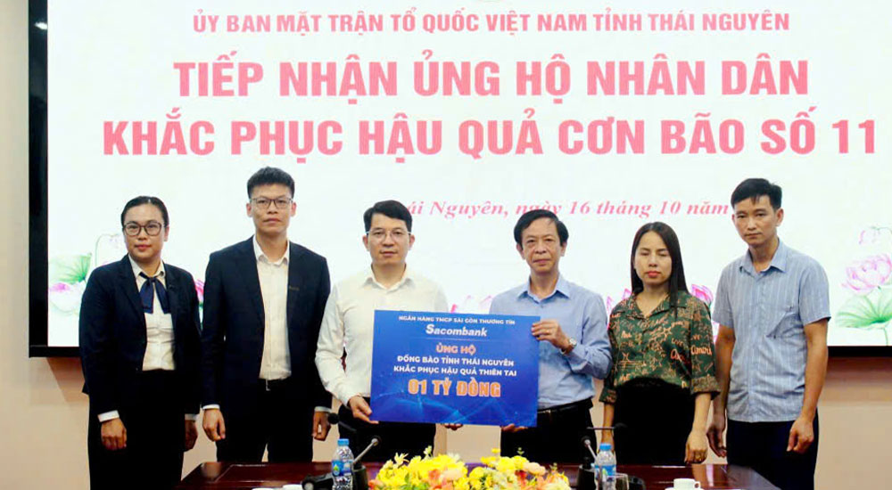 Cụ thể, Sacombank đã trao tặng 1 tỷ đồng cho Ủy ban Mặt trận Tổ quốc Việt Nam tỉnh Thái Nguyên - Quỹ Cứu trợ tỉnh để hỗ trợ công tác khắc phục hậu quả thiên tai; đồng thời trao 300 triệu đồng bằng nhu yếu phẩm thiết yếu cho các hộ dân chịu ảnh hưởng nặng tại các xã/phường như Linh Sơn, Phan Đình Phùng, Tích Lương, Gia Sàng, Trung Thành, Thành Công, Đồng Hỷ, Nam Hoà, Phú Bình.