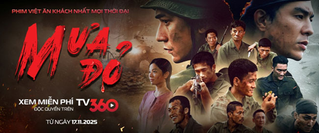 Sau dấu mốc lịch sử với doanh thu 714 tỷ đồng – kỷ lục của điện ảnh Việt Nam, bộ phim “Mưa đỏ” tiếp tục bước sang một hành trình ý nghĩa hơn: từ ngày 17/11/2025, TV360 chính thức phát miễn phí hoàn toàn tác phẩm tới mọi người dân Việt Nam. Đây là hoạt động mang tính cộng đồng sâu sắc của TV360, với mong muốn đưa một trong những bộ phim lịch sử đặc sắc đến với tất cả khán giả, đặc biệt là những người chưa từng có điều kiện tiếp cận phim Việt chất lượng cao hoặc sinh sống tại khu vực vùng sâu, vùng xa chưa có rạp chiếu.