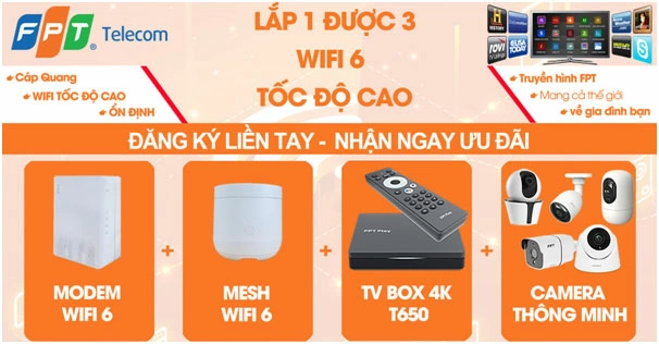 - Miễn phí hoàn toàn thiết bị Modem Wi-Fi 6 và đầu thu FPT Play Box 4K.