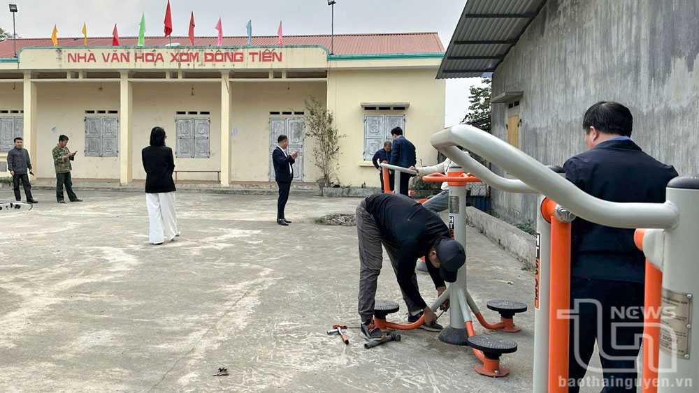 | Nhân dân xóm Đồng Tiến, xã La Bằng (Đại Từ), lắp đặt thiết bị tập luyện thể dục thể thao tại sân nhà văn hóa xóm. |