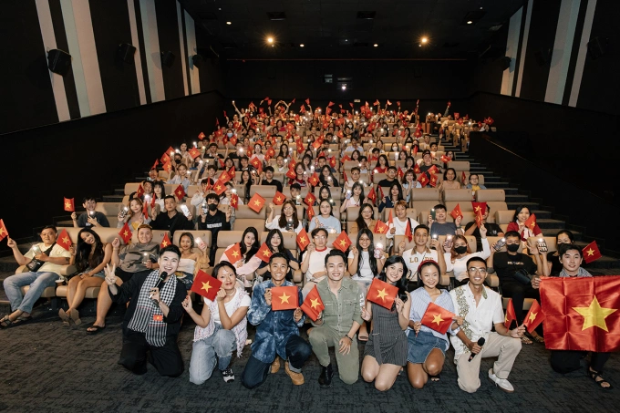 | Dàn diễn viên (hàng đầu) giao lưu với khán giả tại một rạp ở TP HCM cuối tuần qua. Ảnh: Thanh Huyền |