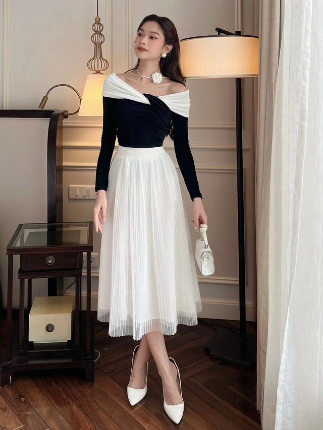 Nàng có thể kết hợp cùng áo sơ mi cổ kín, áo lụa trơn hoặc áo dài tay ôm nhẹ để dễ dàng xuất hiện trong những buổi gặp mặt công việc để tăng sự nữ tính, thướt tha.