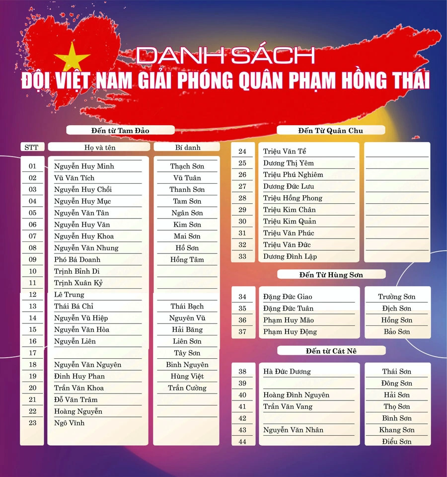 Tìm trong sử liệu, chúng tôi thấy có đoạn: Theo chỉ đạo của Trung ương, của đồng chí Võ Nguyên Giáp, Chỉ huy Đội Cứu Quốc quân 2 Chu Văn Tấn đã về Tam Đảo kiểm tra hoạt động và công nhận Đội tự vệ Tam Đảo, Quân Chu là tổ chức cách mạng. Tháng 4-1945, đồng chí Chu Văn Tấn, Ngô Nhị Quý (Bí thư Tỉnh ủy Thái Nguyên đầu tiên) và Lê Trung Đình (Chủ tịch Chính quyền cách mạng Thái Nguyên sau này) về đây, sáp nhập thêm các đội tự vệ nhỏ lẻ thành lập Đội du kích Cao Sơn, sau đổi thành Trung đội Giải phóng quân Phạm Hồng Thái, đồng chí Nguyễn Huy Minh (Thạch Sơn) làm Trung đội trưởng và Vũ Tuân làm Chính trị viên… Sau thành lập, Trung đội ghi danh ở một số trận đáng nhớ.