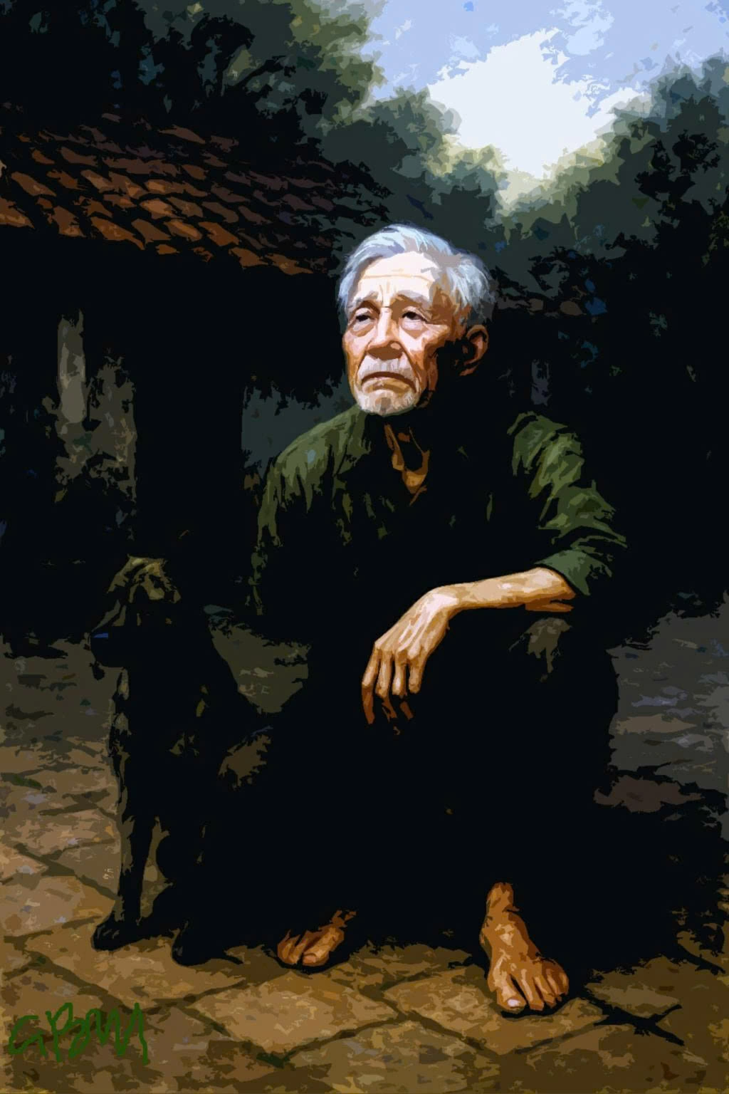 Rồi thì cả căn nhà chỉ có con chó Vện làm bạn với ông. Ông đi đâu nó cũng theo chân lẵng nhẵng. Ngay cả lúc ông ngồi uống rượu một mình nó cũng nằm gác mõm ngó từng động tác của người bạn già. Ông nhậu bằng chuối xanh chấm muối, khế chua, mấy lá đinh lăng, vài ngọn rau húng chó nên con Vện chẳng kiếm chác được gì. Thỉnh thoảng ông dứ chén rượu vào mũi nó hỏi “uống không con?” Có đêm người ta nhìn thấy ông ngồi với con Vện, ngắm trăng.