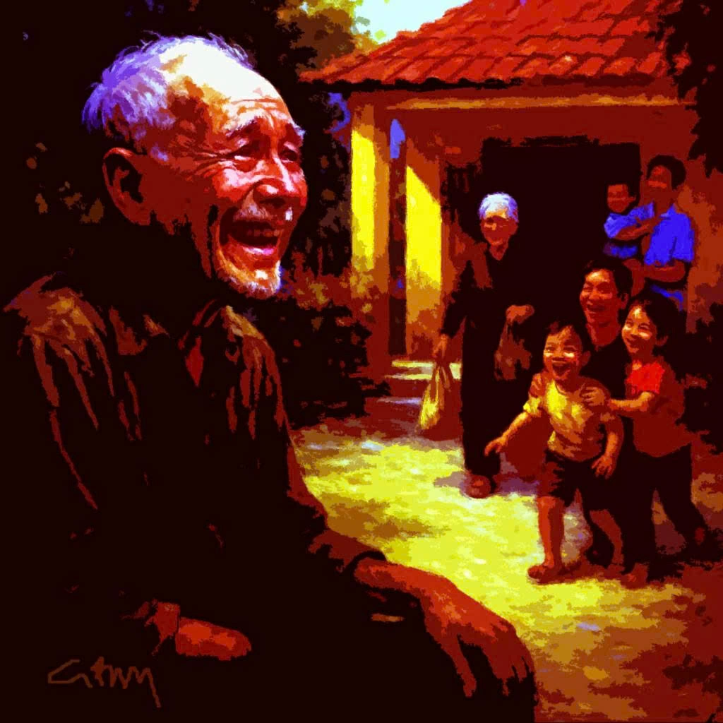 Bà già chỉ cần đứng đó ngó chúng cười cũng sẽ thấy mệt nhọc tiêu tan. Còn hơn ông trở về nhà mà không có ai đợi cửa. Chỉ thấy trên bàn thờ di ảnh mẹ và khói hương lạnh ngắt. Ba gian nhà trống trải đến mức nghe rõ tiếng mọt kêu. Thỉnh thoảng con mèo hàng xóm sẽ sang ăn vụng. Nó giật mình khi thấy ông về nhà nên vội vã chạy thoát thân chỉ còn lại dấu chân trên vung nồi, bàn bếp.