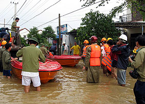 Ông Trần Đắc Đông, phó Đồn trưởng Đồn Biên phòng Cửa Đại, Hội An đang cùng anh em đưa nhân dân đi sơ tán ở thị xã Hội An. Ông nói: Từ năm giờ sáng nay, Đồn biên phòng Cửa Đại đã huy động 40 cán bộ, chiến sĩ cùng với năm phương tiện chia làm hai tốp. Một tốp tiếp tục cứu hộ, cứu nạn tất cả tàu, thuyền bị trôi trên biển. Còn tại đây chúng tôi sơ tán người gia, trẻ em lên chỗ an toàn, tránh lũ. Hiện mưa lũ còn rất phức tạp,