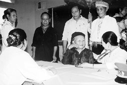 Càng về trưa, các bàn khám, chữa bệnh càng đông người. Thiếu tá, bác sĩ Nguyễn Sĩ Ðạo, Chủ nhiệm Quân y Trung đoàn cùng các y sĩ, y tá, dược tá của đơn vị và địa phương phục vụ đồng bào như chính phục vụ người thân của mình.