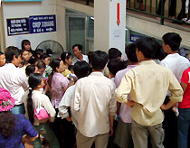 Sáng 29/5, khu khám bệnh Bệnh viện Nhi Trung ương đông nghịt. Các dãy ghế chờ khám đều kín chỗ, nhiều người sốt ruột bế con đi đi lại lại trước phòng bác sĩ.