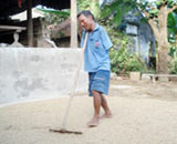 Tiếp đó, ông dùng chân và miệng bó lúa, nâng bổng những bó lúa ấy xếp gọn lại để lấy lối đi rồi ông kẹp chiếc chổi trện vào ngón chân, mềm mại quét lối đi cho khách vào nhà… Tất cả những động tác ấy điêu luyện như một nhà ảo thuật.