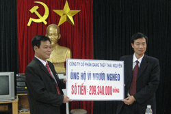 Ngày 1/12, Uỷ ban MTTQ tỉnh Thái Nguyên đã tiếp nhận 509 triệu đồng của cán bộ, công nhân viên chức lao động Công ty Cổ phần Gang thép Thái Nguyên ủng hộ. Trong đó 209 triệu đồng ủng hộ Quỹ vì người nghèo tỉnh Thái Nguyên và 300 triệu đồng ủng hộ đồng bào miền Trung, Tây Nguyên bị ảnh hưởng do thiên tai.