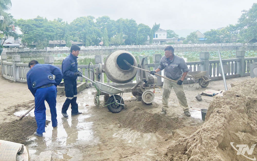 | Công nhân thi công các hạng mục tu bổ, tôn tạo Khu di tích lịch sử Quốc gia 27-7. |