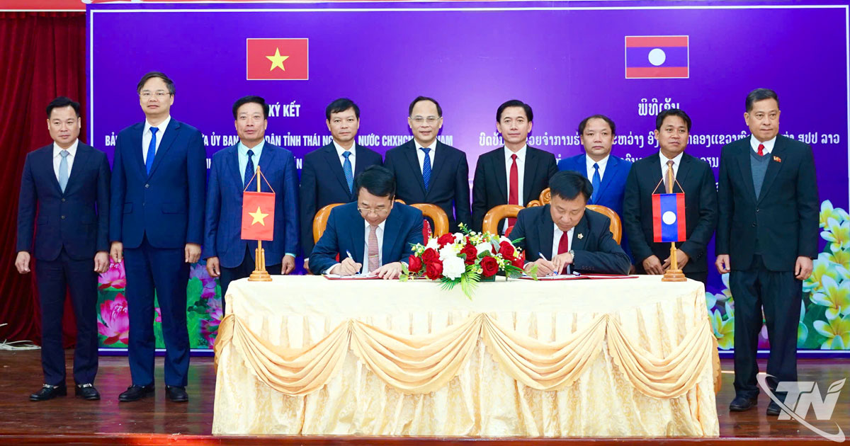 | Đồng chí Nguyễn Thanh Bình và đồng chí Phút Phăn Kẹo Vông Xay ký Bản ghi nhớ hợp tác giữa tỉnh Thái Nguyên và tỉnh Hủa Phăn. |