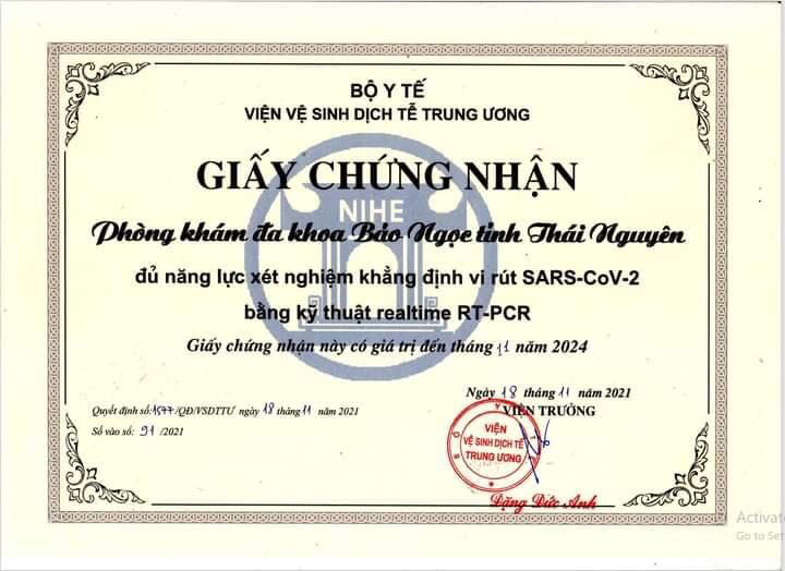 Phòng khám Đa khoa Bảo Ngọc đã được Viện Vệ sinh dịch tễ Trung ương cấp Giấy chứng nhận đủ năng lực xét nghiệm khẳng định vi rút SARS-CoV-2 bằng kỹ thuật Realtime RT-PCR.