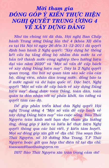 Báo Thái Nguyên hằng tháng số 4, phát hành ngày 01-01-2012 có nội dung và hình thức phong phú, với những bài viết: Thị trường lành mạnh cho người tiêu dùng; Tạo tiền đề vững chắc để Thái Nguyên trở thành tỉnh công nghiệp; Trường Sa – Hòn đảo xanh; Lời của trái tim; Ký ức Tết quê; Xi măng Thái Nguyên gặp khó trong tiêu thụ sản phẩm; Đến với người gác rừng; Bảo vệ hệ sinh thái hồ Núi Cốc…