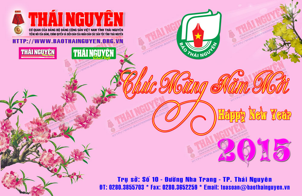 Nhân dịp năm mới 2015, Ban Biên tập Báo Thái Nguyên xin gửi lời cảm ơn đến các đồng chí lãnh đạo tỉnh, các cấp, các ngành và bạn đọc xa gần năm qua đã góp sức để tờ báo Đảng bộ tỉnh hoàn thành xuất sắc nhiệm vụ được giao. Chúc các đồng chí và gia đình năm mới AN KHANG - THỊNH VƯỢNG - THÀNH ĐẠT !