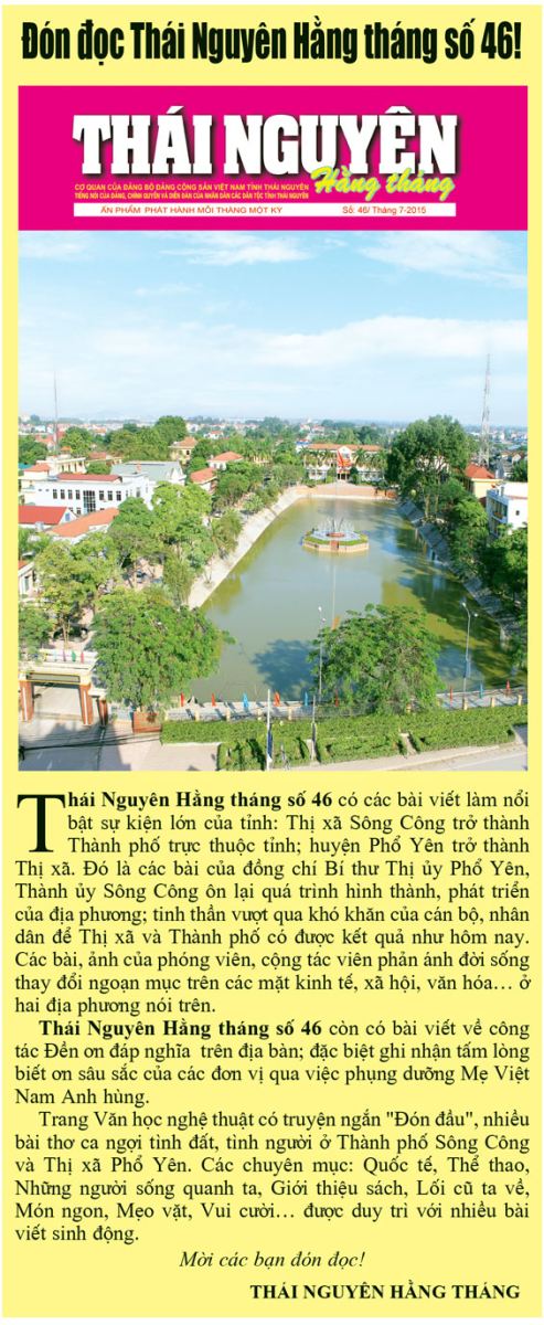 Chào mừng Giỗ tổ Hùng Vương; 40 năm Ngày giải phóng miền Nam thống nhất đất nước (30/4/1975-30/4/2015); Ngày Quốc tế lao động (1-5), Báo Thái Nguyên phát hành số đặc biệt gộp 6 số: Từ số 4624 đến 4629 (ra các ngày 28, 29, 30-4 và 1, 2, 3-5-2015), in 4 mầu, bìa cutse, phát hành ngày 27-4 với các bài viết hấp dẫn: