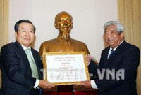Ông Im Hong Jae (trái) trao tiền ủng hộ cho Chủ tịch Phạm Thế Duyệt Sáng 24.10, Đại sứ đặc mệnh toàn quyền Hàn Quốc tại Việt Nam - ông Im Hong Jae đã trao 50.000 USD cho Chủ tịch Ủy ban Trung ương MTTQ Việt Nam Phạm Thế Duyệt, là số tiền Chính phủ Hàn Quốc gửi giúp đỡ những người dân Việt Nam bị ảnh hưởng cơn bão số 5.