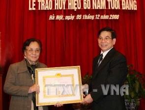 Thay mặt Đảng và Nhà nước, chiều 5/12, Chủ tịch nước Nguyễn Minh Triết đã trao Huy hiệu 60 năm tuổi Đảng cho nguyên Phó Chủ tịch nước Nguyễn Thị Bình. Huy hiệu 60 năm tuổi Đảng là sự ghi nhận những thành tích và cống hiến to lớn của nguyên Phó Chủ tịch nước Nguyễn Thị Bình đối với sự nghiệp cách mạng vẻ vang của Đảng và của dân tộc.