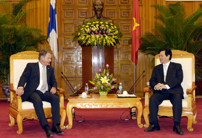 Thủ tướng Nguyễn Tấn Dũng bày tỏ vui mừng khi quan hệ hữu nghị truyền thống tốt đẹp giữa hai nước đang phát triển trên tất cả các lĩnh vực, nhất là sau chuyến thăm Việt Nam của Thủ tướng Phần Lan Matti Vanhanen trong năm qua.